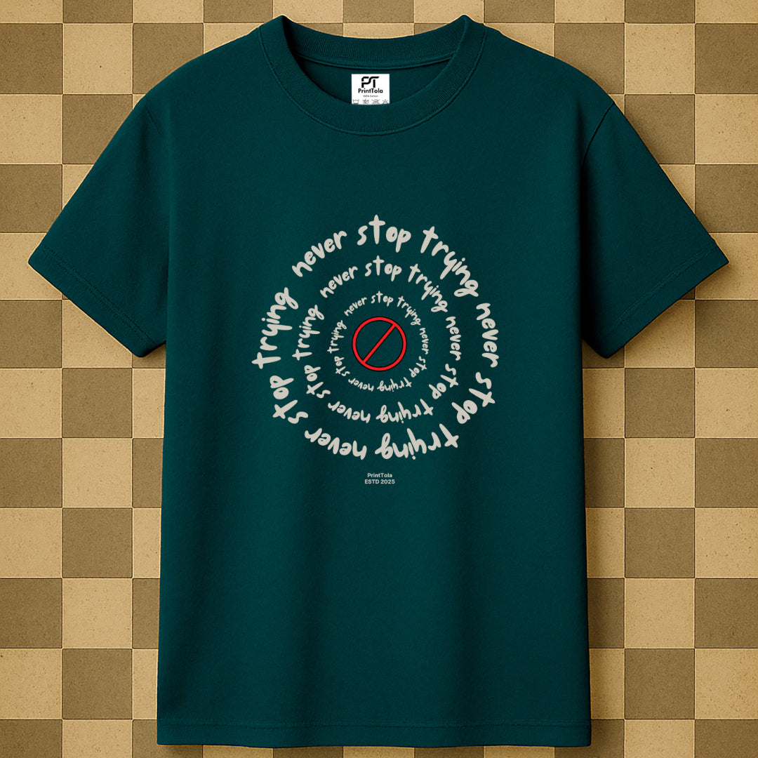 A design that motivates in motion — the Never Stop Trying T-shirt features the powerful phrase printed repeatedly in a spiral (coil) form, symbolizing persistence, growth, and endless effort. Made from 100% premium cotton and biowash treated for unmatched softness and lasting comfort, this tee turns inspiration into style.